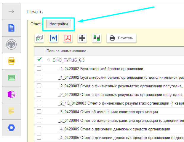 В программе Фабрика XBRL предусмотрена функция «Сохранение пометок печатных форм». Она позволяет сохранить выбор отчетов для печати, чтобы не отмечать их вручную при каждом формировании идентичных комплектов отчетности.
