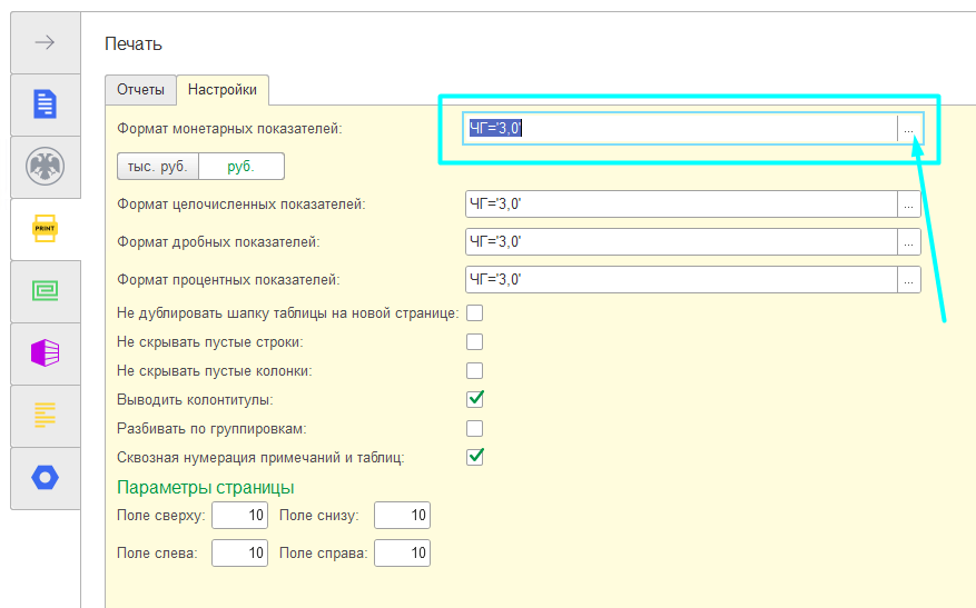 Настройки параметров вывода данных находятся на вкладке «Настройки» в разделе печати конкретного экземпляра отчета.