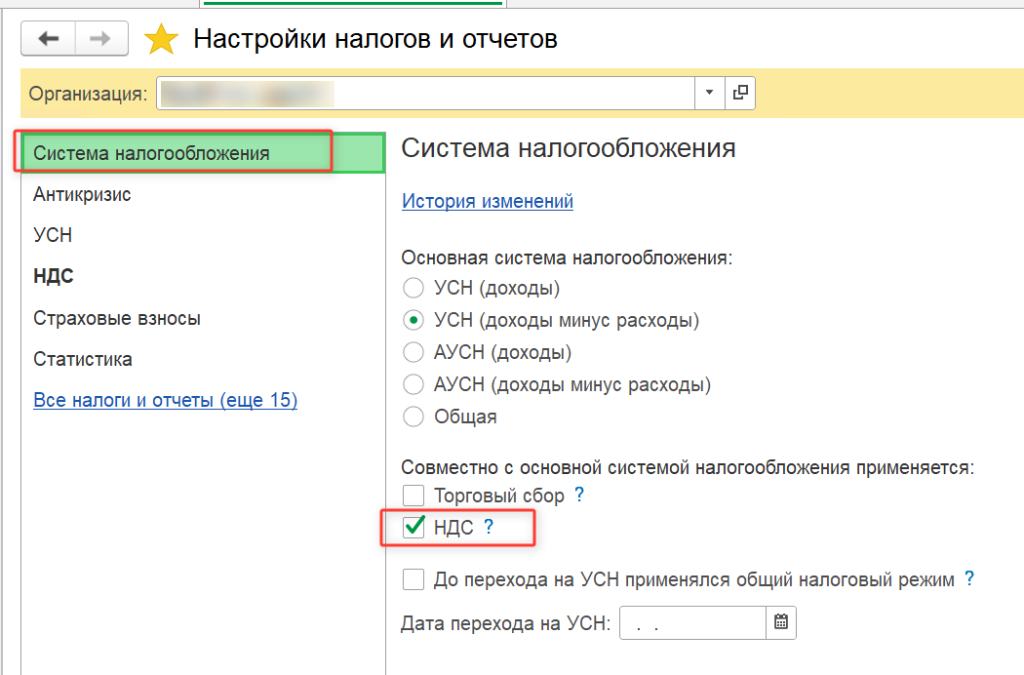 Выбранный на 2026 год режим налогообложения необходимо установить в настройках налогов и отчетов на закладке “Система налогообложения”: раздел Главное – подраздел Настройки – Налоги и отчеты.