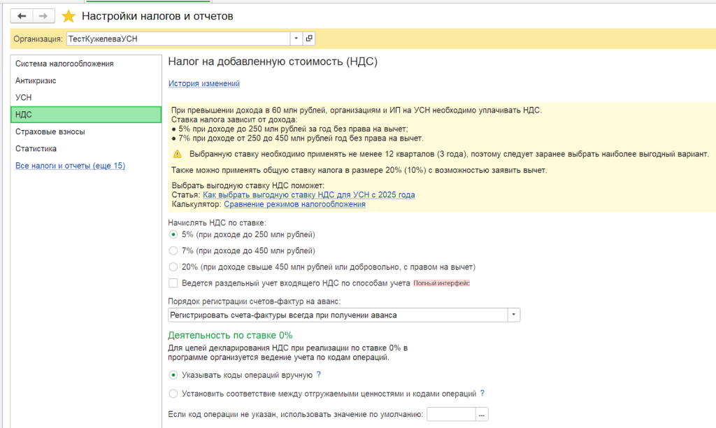 Для настройки налогообложения НДС на закладке НДС (раздел Главное – подраздел Настройки – Налоги и отчеты) установите применяемую с 01.01.2026 ставку НДС.